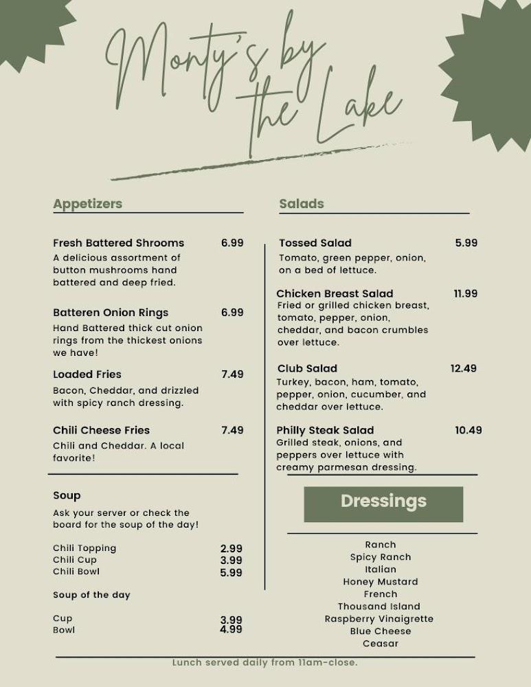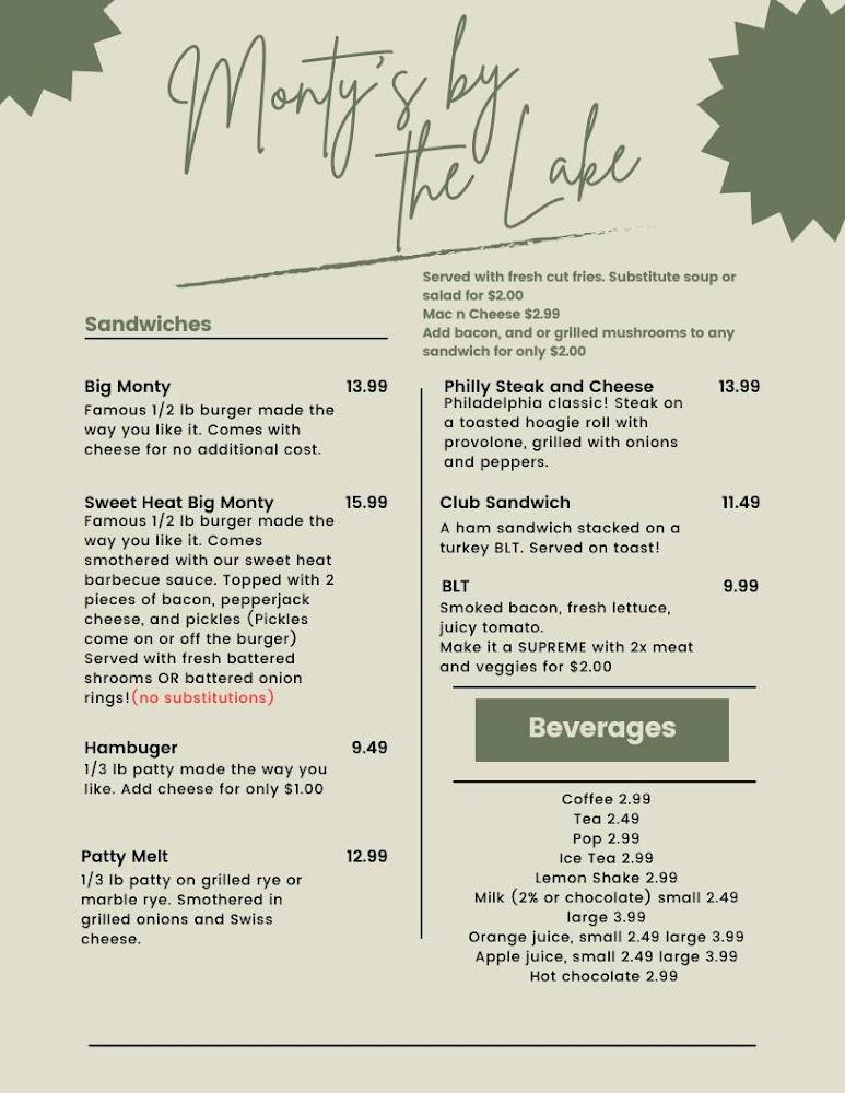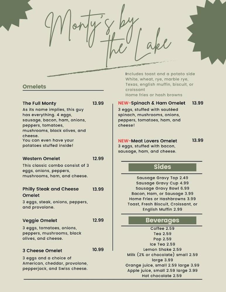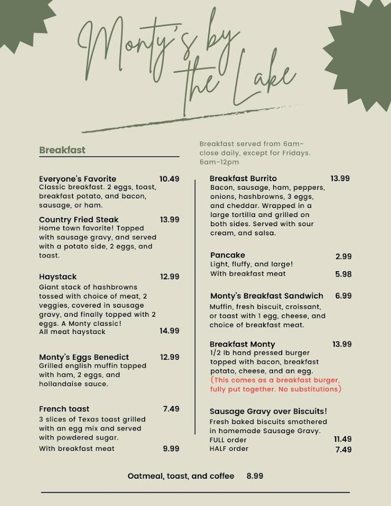 Welcome to Monty's By The Lake, your go-to American restaurant in Cortland, OH! Embrace the family-friendly atmosphere while savoring delicious home-cooked meals crafted to bring comfort and joy. Our friendly staff is dedicated to providing excellent service, whether you're stopping by for breakfast, lunch, or dinner. Enjoy a delectable selection of desserts, coffees, and local specialties, all in a cozy setting perfect for families, groups, and tourists alike. We offer dine-in, takeout, and delivery options, ensuring that your dining experience is convenient and enjoyable. Join us at 1241 Greenville Rd NE for a meal that feels like home!